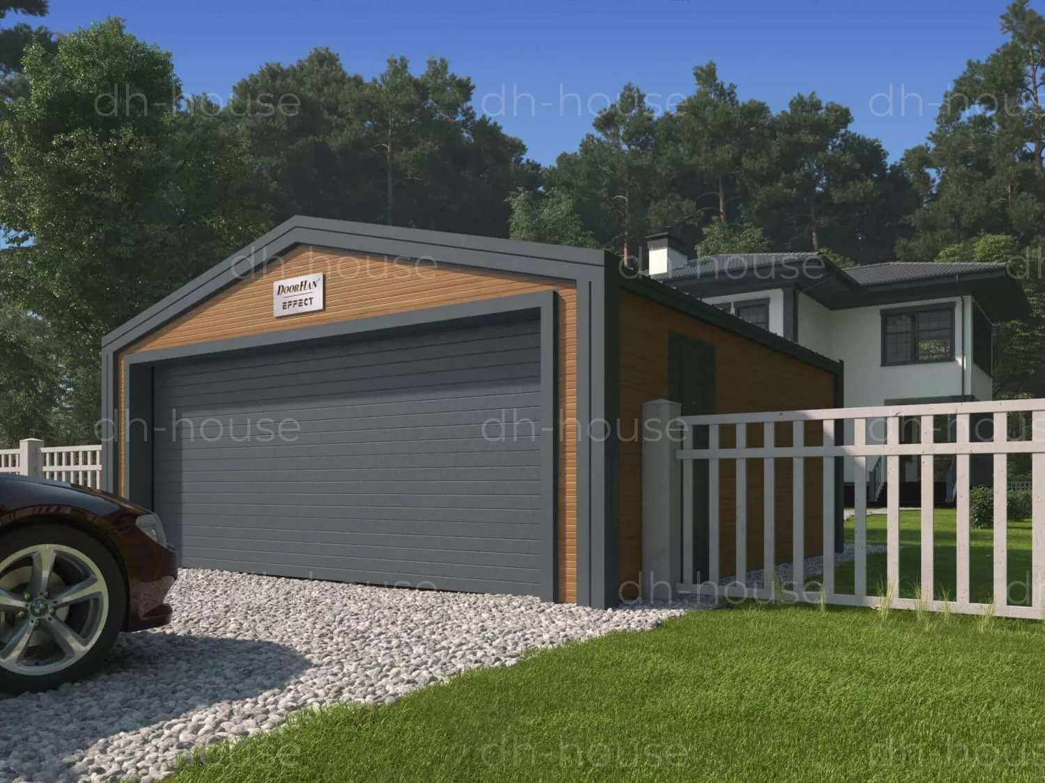 Гараж DoorHan представляет собой двускатное строение для стоянки автомобиля в Пятигорске. Выполнен в виде прямоугольной конструкции. Несущую функцию выполняет металлический каркас, собранный из профиля С-образной формы с оцинкованной поверхностью. Для обшивки кровли и стен выбраны PIR-панели. Цвета внешних стеновых панелей — золотой дуб, кровельных уличных панелей — RAL 7016, стен и кровли внутри — RAL 9003.